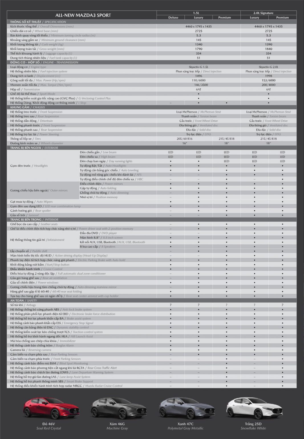 Mazda 3 Sport 2020 sử dụng động cơ SKYACTIV-G 2.0 DOHC 16 van, 4 xy-lanh thẳng hàng cho phép sản sinh công suất 162 mã lực và mô men xoắn cực đại 213 Nm. Xe sử dụng hộp số tự động 6 cấp với hệ dẫn động cầu trước.