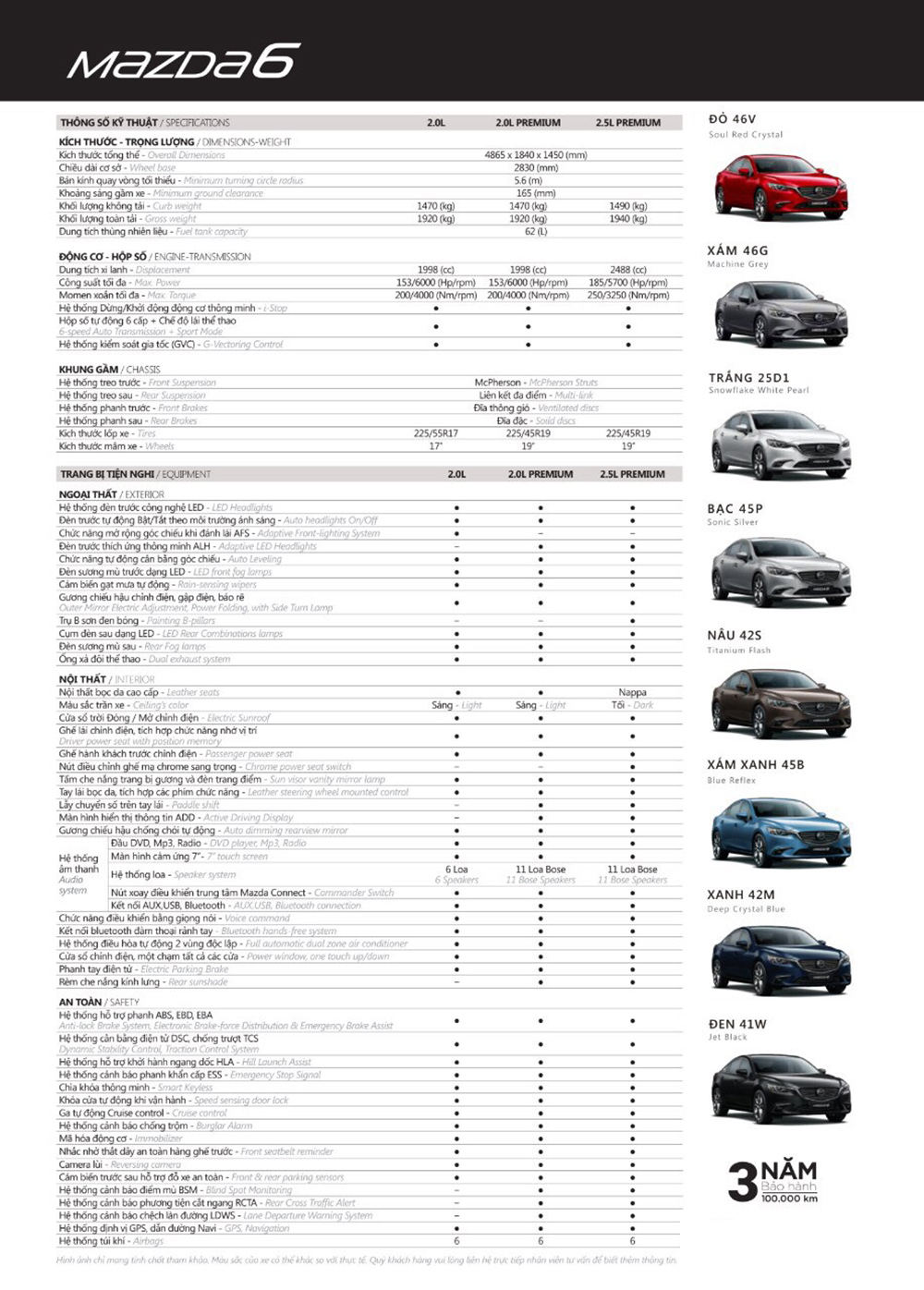 Mazda 6 sở hữu kích thước tổng thể Dài x Rộng x Cao lần lượt là 4.865 x 1.840 x 1.450 (mm), trục cơ sở 2.830 (mm), khoảng sáng gầm 165 (mm) và bán kính vòng quay 5,6 mét.