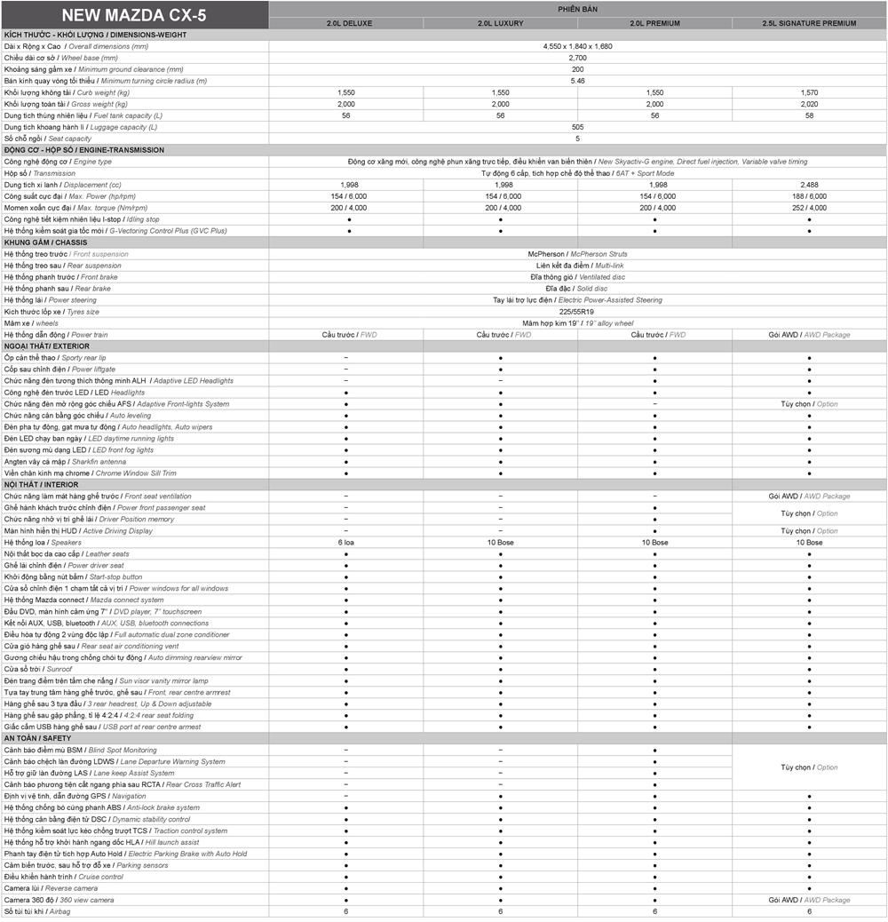 Với gói trang bị i-Activsense, Mazda CX-5 2020 được xem là cái tên an toàn bậc nhất phân khúc hiện nay. Ngoài ra, xe còn sở hữu hầu hết các tính năng an toàn thường thấy khác như phanh tay điện tử, hệ thống tự động giữ phanh Auto Hold…v